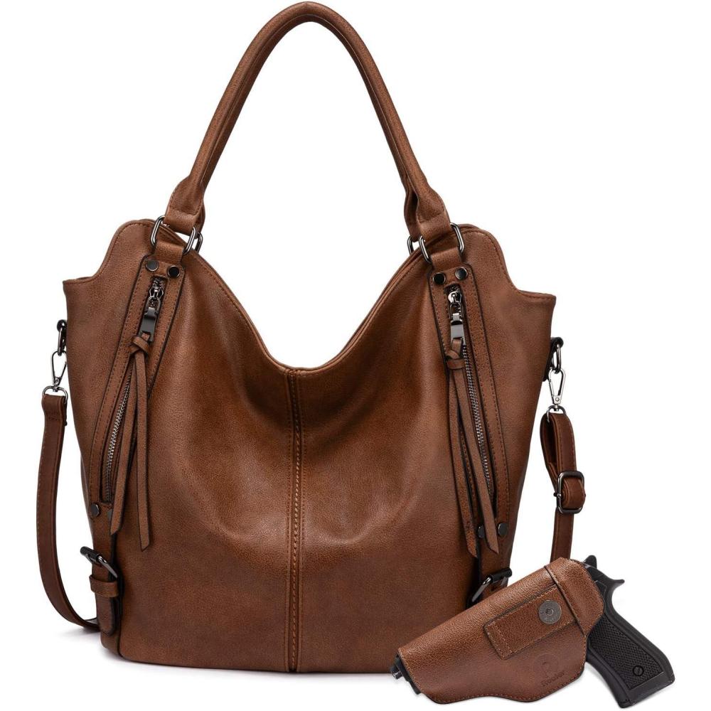 Concealed Carry Hobo Purse for Women Faux Leather Crossbody Shoulder Bags Large Tote Bag with Detachable Holster(Brown)